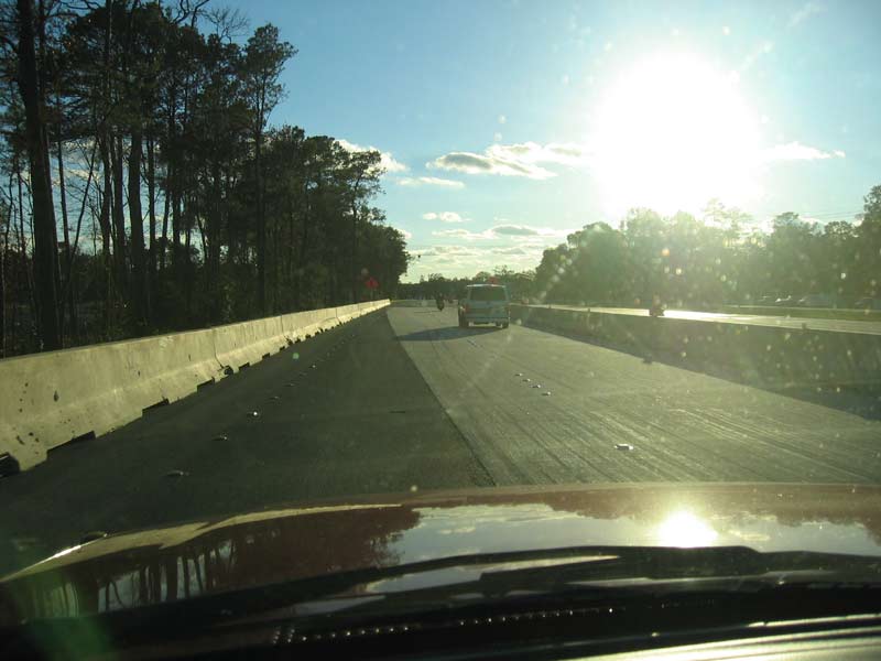 Well, it couldn't have been more than 60 seconds, and probably not more than 30 before my mind's flight of whimsy came to fruitation. One second I was behind a U-Haul truck which had a car in tow. The next second the car decided it preferred being un-towed and ventured off to seek its own destiny. With a cry of glee it broke free of its shackles completely and jumped into the fast lane. Unfortunately the car was so used to being driven by a human that it wasn't quite sure what to do when there was no driver present. The car slammed into the cement barrier you see in the picture, shattering the back window and showering my truck with bits of glass.
